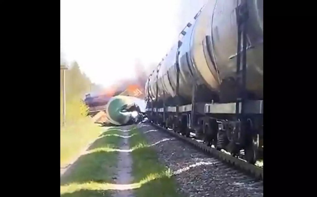 This train carrying oil products and construction material derailed in Bryansk Oblast, Russia. 7-8 cars have been compromised. It is said that an explosive device on the railway track was used. #Bryansk #Russia pic.twitter.com/oy2SYLj9ff
