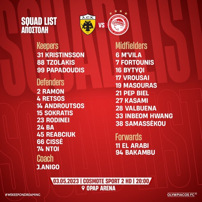 Ο Ολυμπιακός ανακοίνωσε την αποστολή του για το ντέρμπι με την ΑΕΚ στη Νέα Φιλαδέλφεια. Ο Ινμπόμ Χουάνγκ ξεπέρασε τις ενοχλήσεις και μπήκε στις επιλογές του Ανιγκό αλλά είναι αμφίβολο αν μπορεί να βγάλει ολόκληρο ματς. Ο Σέρχι Κανός έμεινε και πάλι εκτός παρά την προσπάθεια που έκανε να προλάβει το παιχνίδι. Να θυμίσουμε ότι Πασχαλάκης και Γκάρι Ροντρίγκες είναι επίσης τραυματίες.