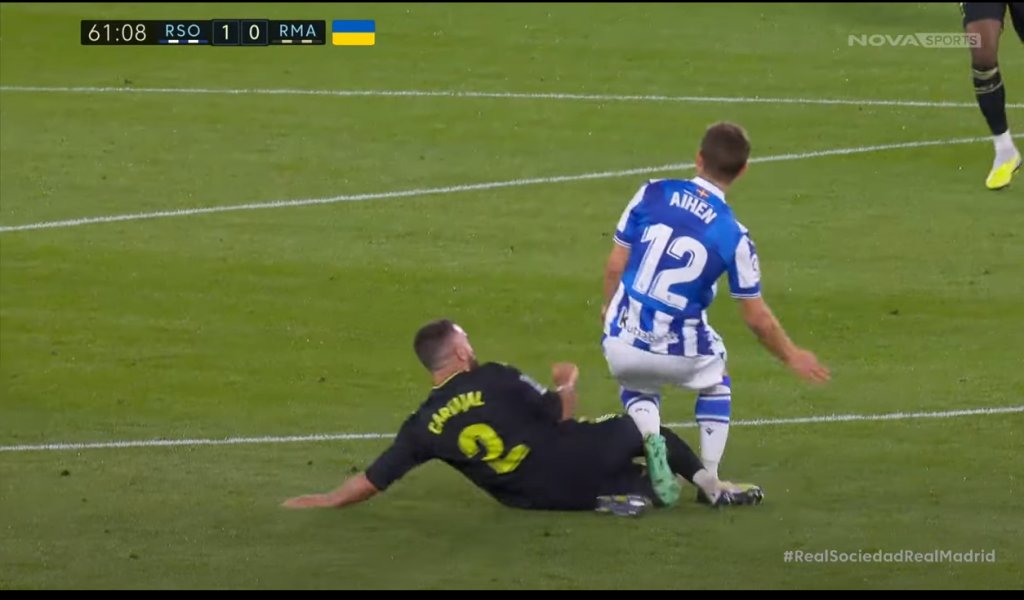 Σε διάστημα οκτώ λεπτών, ο Ντάνι Καρβαχάλ είδε δυο φορές τη κίτρινη κάρτα και στο 61' άφησε τη Ρεάλ Μαδρίτης με δέκα παίκτες, ενώ η Ρεάλ Σοσιεδάδ προηγούνταν 1-0.