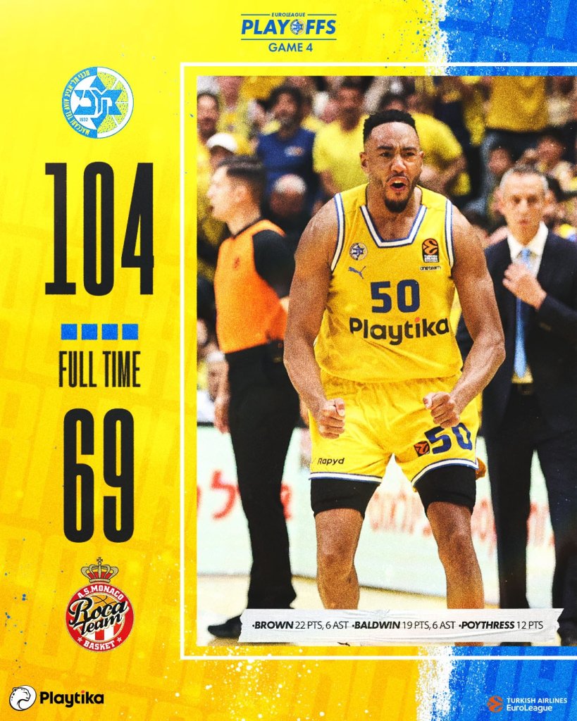 Η Μακάμπι εφάρμοσε τον... νόμο του Τελ Αβίβ, ισοφάρισε εντυπωσιακά τη σειρά (2-2) «πνίγοντας» την Μονακό (104-69) και η πρόκριση στο Final Four θα κριθεί σε Game 5 - φωτιά στο Πριγκιπάτο (10/5, 20:00).