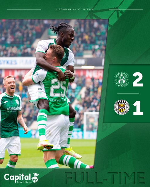 Η Χιμπέρνιαν νίκησε 2-1 τη Σεντ Μίρεν και βρίσκεται ένα βαθμό πίσω από τη τέταρτη θέση, με την ομάδα του Εδιμβούργου να κάνει ακόμα ένα βήμα για έξοδο στις ευρωπαϊκές διοργανώσεις.