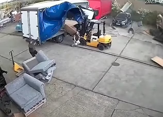 Το κλιπ, το οποίο τραβήχτηκε στο Horham του Suffolk, δείχνει υπάλληλο μεταφορικής να πέφτει στα γόνατα και να προσπαθεί απεγνωσμένα να κρατηθεί στο έδαφος σε μια προσπάθεια να μην τραυματιστεί.