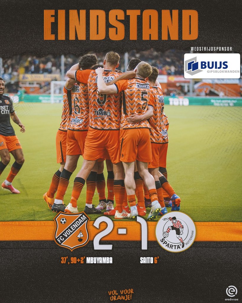 Νίκη παραμονής για τη Φόλενταμ. Η ομάδα του Μπέρι Σμιτ αν και βρέθηκε από νωρίς πίσω στο σκορ, κατάφερε χάρη σε δύο τέρματα του Εμπουγιάμπα να κερδίσει με 2-1 την Σπάρτα Ρότερνταμ και να πάρει μεγάλη βαθμολογική ανάσα.