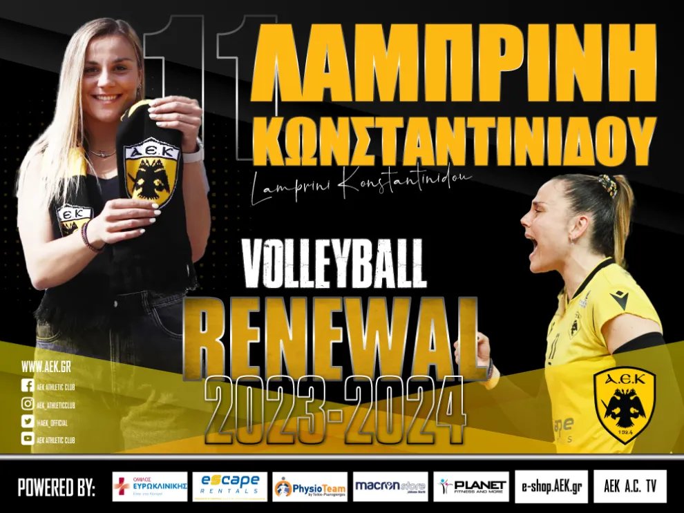 «Η ΑΕΚ βρίσκεται στην ευχάριστη θέση να ανακοινώσει την ανανέωση της συνεργασίας της με την Λαμπρινή Κωνσταντινίδου. Η 26χρονη (16/09/1996) διεθνής πασαδόρος, υπέγραψε νέο συμβόλαιο και θα παραμείνει στο δυναμικό της γυναικείας ομάδας Βόλεϊ του Συλλόγου, τουλάχιστον ως το καλοκαίρι του 2024.