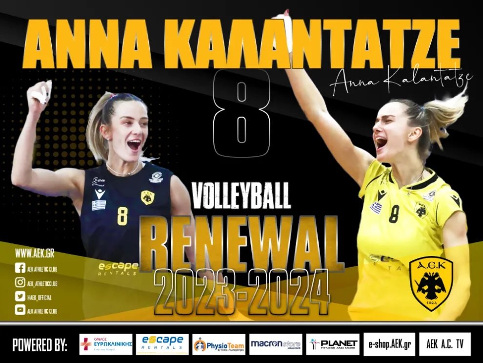 Η ΑΕΚ βρίσκεται στην ευχάριστη θέση να ανακοινώσει την ανανέωση της συνεργασίας της με την Άννα Καλαντάτζε. Η 26χρονη (13/08/1997) διεθνής κεντρική, ύψους 1,82 μ., υπέγραψε μονοετές συμβόλαιο και θα συνεχίσει να φοράει τη φανέλα της ΑΕΚ.