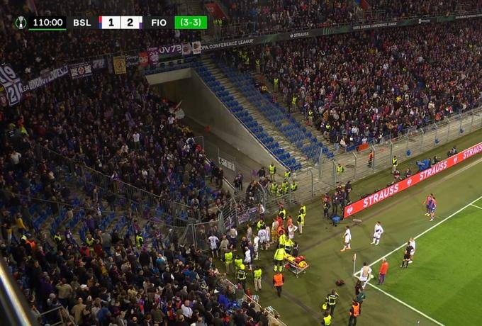 The game has been halted while medics try to reach a Fiorentina fan in the away end. #UECL #FCBFIO pic.twitter.com/hWlrJxlrpA