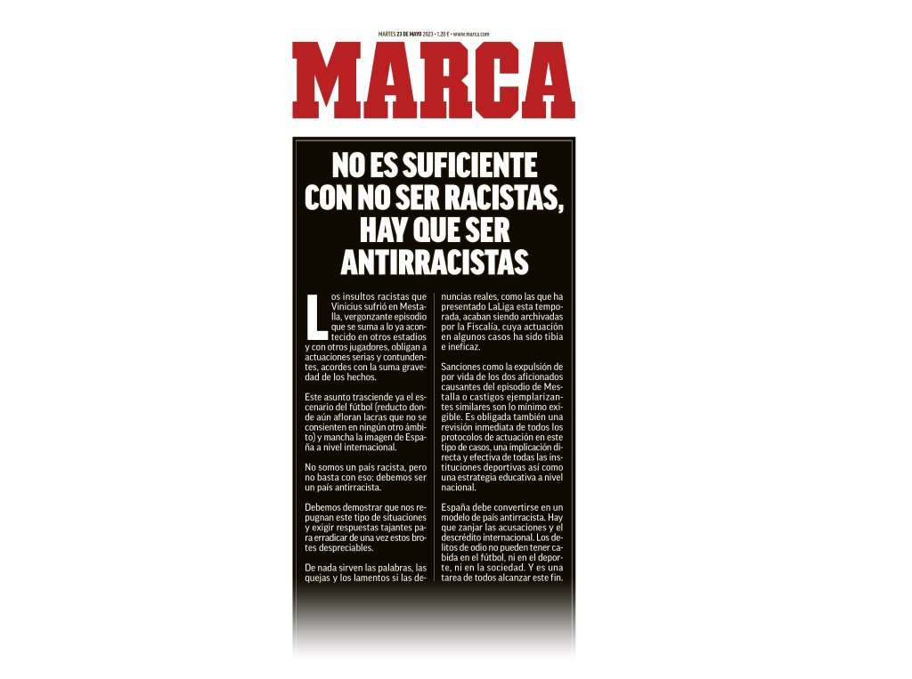 «Δεν είναι αρκετό να μην είσαι ρατσιστής, πρέπει να είσαι αντιρατσιστής», γράφει χαρακτηριστικά το ισπανικό Μέσο σε όλο το πρωτοσέλιδο στέλνοντας ένα σημαντικό αντιρατσιστικό σημείωμα.