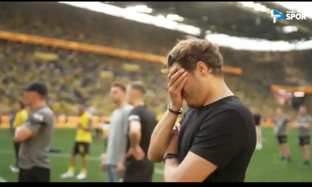 Borussia Dortmund fan-turned-head coach Edin Terzic in tears as the Südtribüne chants his name after losing the title.
