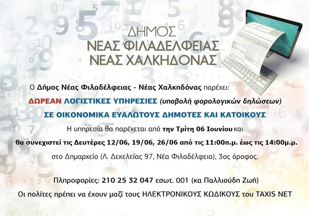 Στα πλαίσια των δράσεων Κοινωνικής Πολιτικής που έχουν αναπτυχθεί στον Δήμο Νέας Φιλαδέλφειας – Νέας Χαλκηδόνας για τους οικονομικά ευάλωτους πολίτες, συνεχίζεται και φέτος η δωρεάν παροχή λογιστικών υπηρεσιών (υποβολή φορολογικών δηλώσεων) στους δημότες που είναι εγγεγραμμένοι στις λίστες της κοινωνικής μας υπηρεσίας.