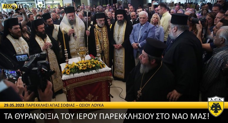Η επίσημη ενημέρωση της ΠΑΕ ΑΕΚ αναφέρει: «Το απόγευμα της Δευτέρας 29 Μαΐου, τελέστηκαν με λαμπρότητα τα θυρανοίξια του Ιερού Παρεκκλησίου της του Θεού Σοφίας και του Οσίου και Θεοφόρου Πατρός ημών Λουκά του εν Στειρίω, το οποίο βρίσκεται στο νέο γήπεδο της ομάδας μας, στη Νέα Φιλαδέλφεια.