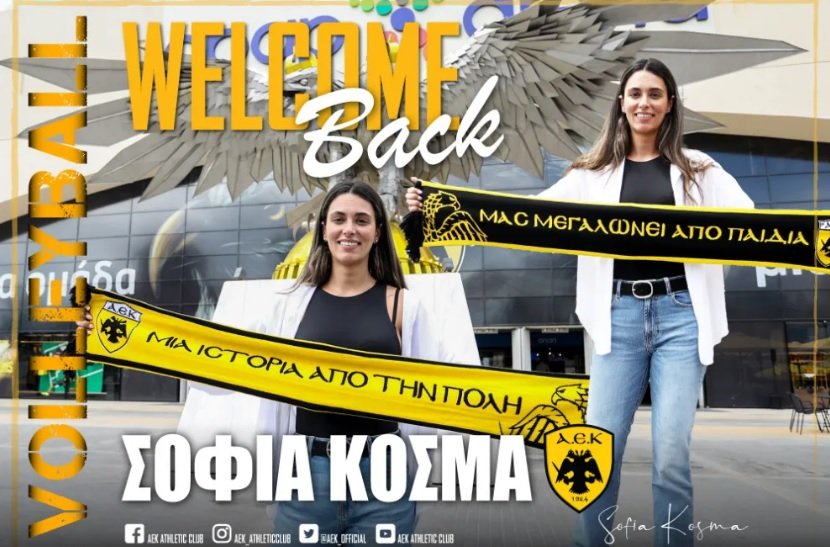 H AEK βρίσκεται στην ευχάριστη θέση να ανακοινώσει την έναρξη της συνεργασίας της με την Σοφία Κοσμά. Η 29χρονη (15/11/1993) αθλήτρια, ύψους 1,80 μ., υπέγραψε μονοετές συμβόλαιο και επιστρέφει στη γυναικεία ομάδα Βόλεϊ της ΑΕΚ.