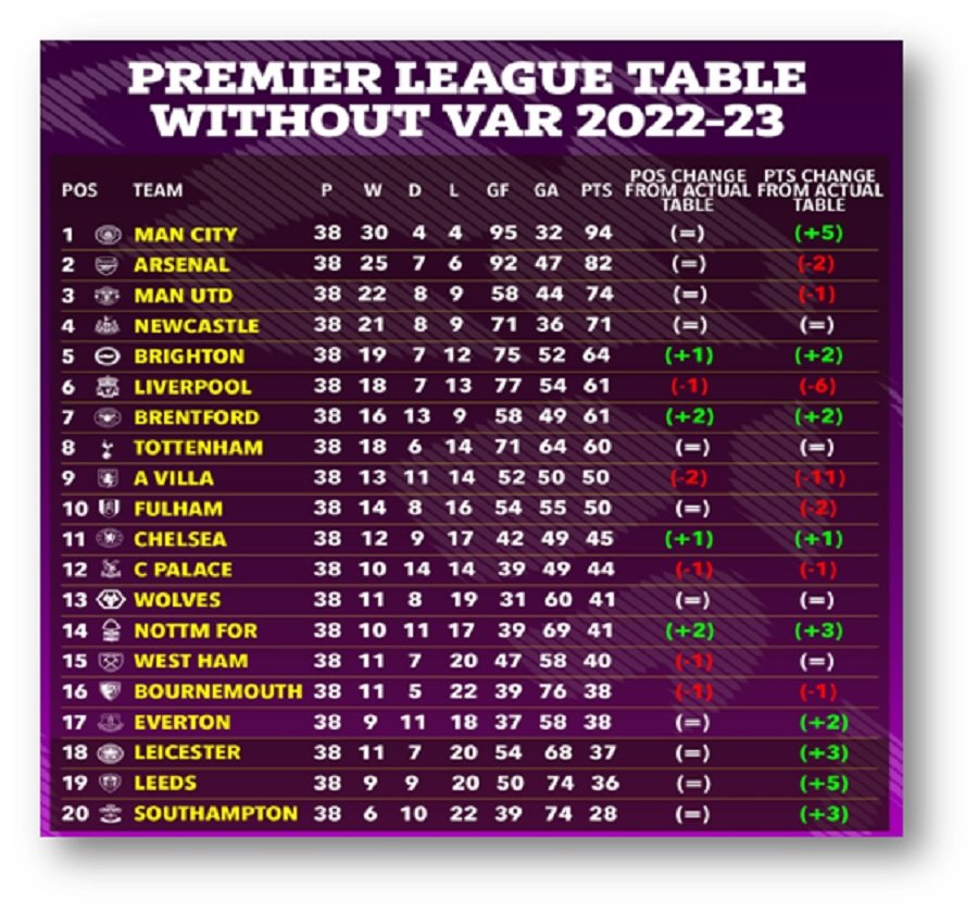 Σύμφωνα με τον παρακάτω πίνακα η Μάντσεστερ Σίτι θα τελείωνε την σεζόν με 12 πόντους διαφορά αντί για 5, από την Άρσεναλ καθώς οι «πολίτες» θα έπαιρναν επιπλέον 5 βαθμούς, ενώ οι «κανονιέρηδες» θα μάζευαν 2 λιγότερους.