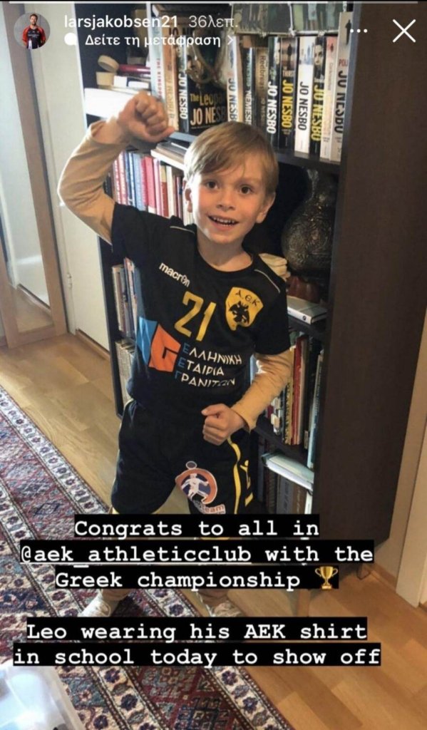 Η ομάδα χάντμπολ της ΑΕΚ από χθες πανηγυρίζει την κατάκτηση του Πρωταθλήματος της Handball Premier και ο Λαρς Γιάκομπσεν πανηγυρίζει μαζί της. Ο πρώην παίκτης της ΑΕΚ ανέβασε φωτογραφία με τον γιο του να φοράει την «κιτρινόμαυρη» φανέλα και να πηγαίνει σχολείο με αυτή.