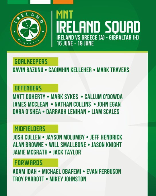 Ανακοινώθηκε η αποστολή της Ιρλανδίας για τους επερχόμενους προκριματικούς αγώνες του Euro 2024 με την Ελλάδα (16 Ιουνίου) στην «Αγιά Σοφιά», και το Γιβραλτάρ (19 Ιουνίου) στο «Aviva Stadium».