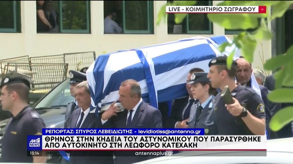 Συγγενείς, φίλοι και πολλοί συνάδελφοι αποχαιρετούν τον αστυνομικό που έχασε τη ζωή του εν ώρα υπηρεσίας στην Κατεχάκη, αφού παρασύρθηκε από αυτοκίνητο