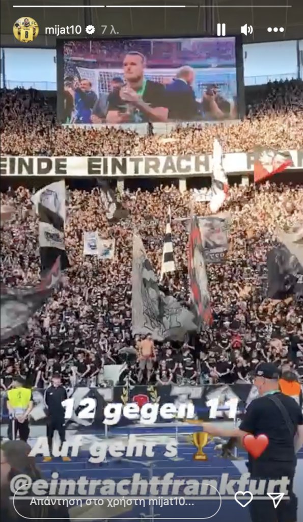 Ο Μιγιάτ Γκατσίνοβιτς όπως είχε κάνει γνωστό σε δηλώσεις του, είναι προσκεκλημένος της Άιντραχτ και βρίσκεται στο Βερολίνο για τον τελικό του Κυπέλλου Γερμανίας απέναντι στην Λειψία. Ο διεθνής Σέρβος άσος της ΑΕΚ, που έχει γράψει τη δική του ιστορία φορώντας την φανέλα της Άιντραχτ και μάλιστα με δικό του γκολ είχε σφραγιστεί το 3-1 επί της Μπάγερν στον τελικό του 2018, ανέβασε ένα βίντεο με τον κόσμο όπου γράφει “12 εναντίον 11, Πάμε”, δίνοντας με αυτόν τον τρόπο την θετική του ενέργεια στην Άιντραχτ για να φτάσει στην κατάκτηση ενός ακόμα Κυπέλλου!