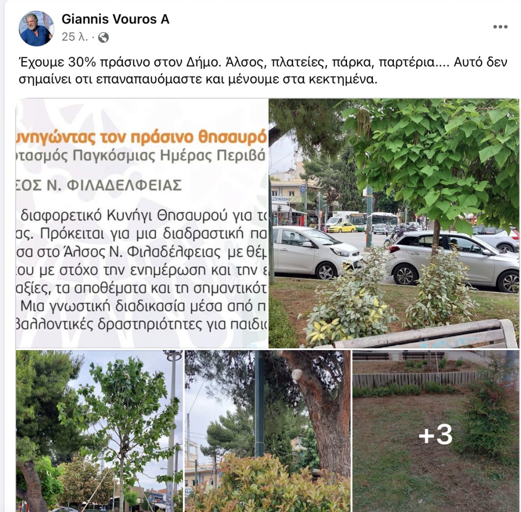Σε αυτό το πλαίσιο τις τελευταίες μόνο ημέρες φυτεύθηκαν δύο (2) πλατάνια καθώς και 60 μυρτιές (θάμνοι), ενώ θα ακολουθήσει την προσεχή εβδομάδα η φύτευση 800 λουλουδιών, σε σημεία που έχουν επιλέξει οι γεωπόνοι της Διεύθυνσης Περιβάλλοντος και Πρασίνου του Δήμου μας σε συνεννόηση πάντα με τον αρμόδιο Αντιδήμαρχο Πρασίνου και άλσους Σωτήρη Κοσκολέτο.
