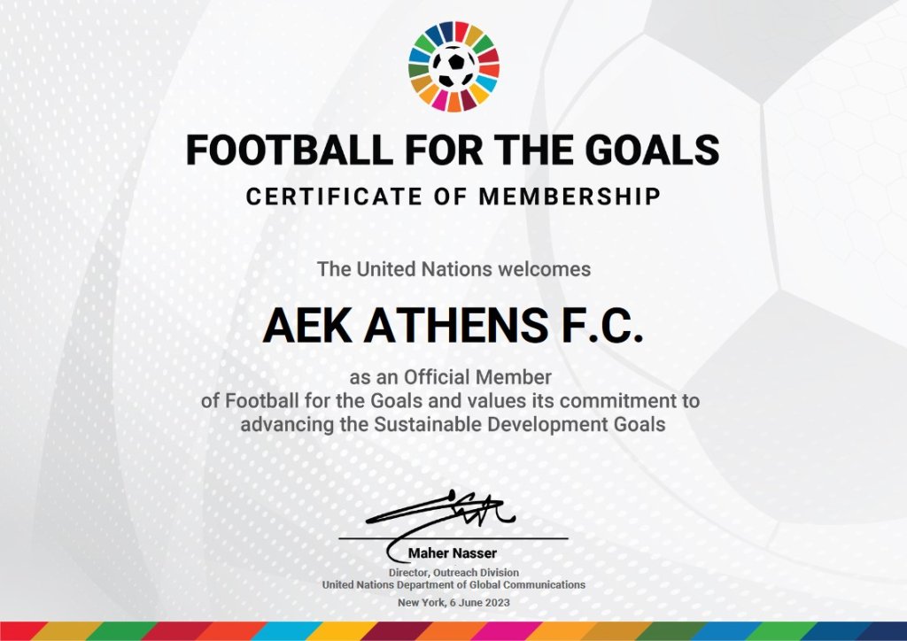 Μέλος του Football for the Goals είναι επίσημα από σήμερα η ΠΑΕ ΑΕΚ. Το FFTG είναι μια πρωτοβουλία των Ηνωμένων Εθνών που παρέχει μια πλατφόρμα για την παγκόσμια ποδοσφαιρική κοινότητα, προκειμένου να συνεργαστεί και να υποστηρίξει τους Στόχους Βιώσιμης Ανάπτυξης (SDG), όπως υιοθετήθηκαν στο πλαίσιο της 70ης Γενικής Συνέλευσης του ΟΗΕ.