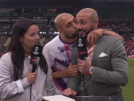 O Νορντίν Άμραμπατ βρίσκεται στην Πράγα ως σχολιαστής του τελικού του Conference League. Ενώ μιλούσε με την παρουσιάστρια ο αδελφός του Σοφιάν εμφανίστηκε στο πλάνο και τον φίλησε. Ο Σοφιάν θα αγωνιστεί με την Φιορεντίνα για το ευρωπαϊκό τρόπαιο.