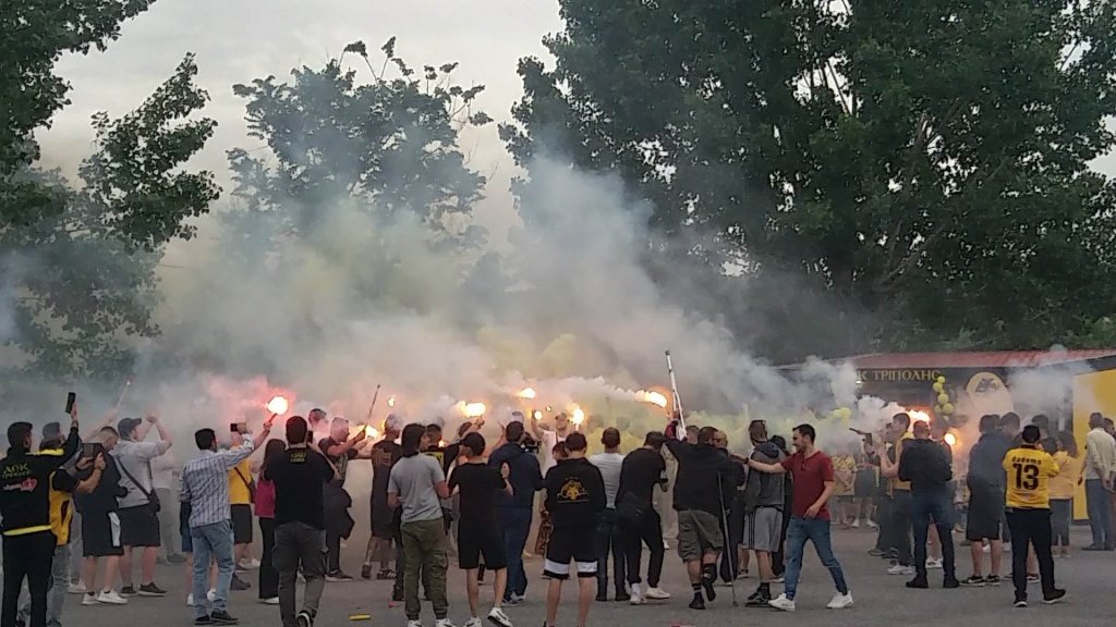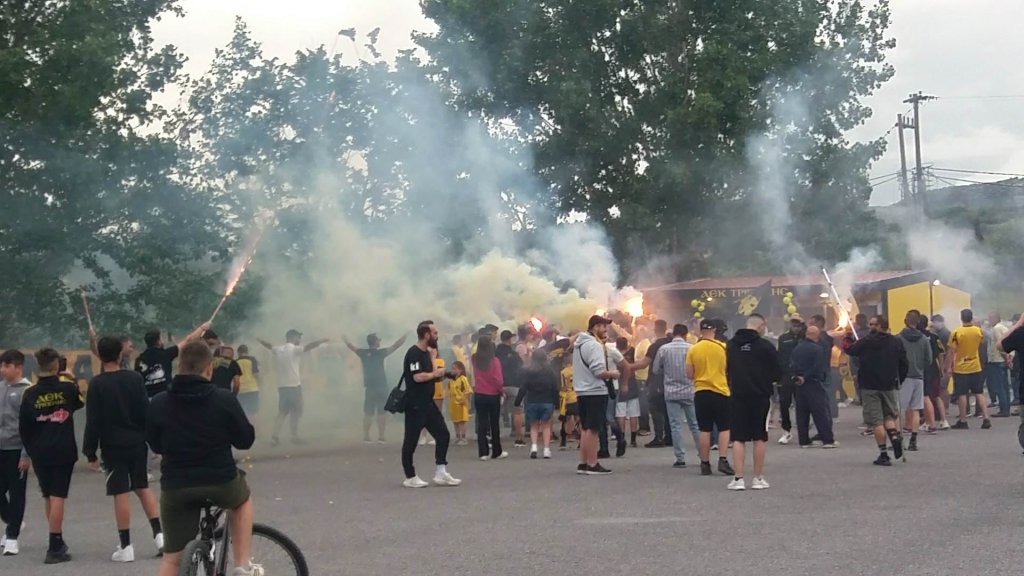 Στην υποδοχή του τροπαίου πολύς κόσμος της ΑΕΚ ήταν εκεί, δημιουργώντας μία υπέροχη ατμόσφαιρα, όπως θα δείτε στις φωτογραφίες που πόσταρε στο facebook η «δημοτική ραδιοφωνία Τρίπολης», όπως και ο δημοσιογράφος Σταύρος Ζορμπαλάς: