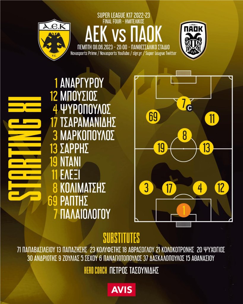 Γνωστή έγινε η 11άδα της ΑΕΚ Κ17 για το ματς κόντρα στην αντίστοιχη του ΠΑΟΚ, στον μεταξύ τους ημιτελικό στο πλαίσιο του final 4 της Super League Κ17 που διεξάγεται στο Πανθεσσαλικό. Ο προπονητής της ΑΕΚ, Πέτρος Τασουνίδης, με διάταξη 4-3-3 επέλεξε να ξεκινήσουν το ματς οι: Αναργύρου, Μπούσιος, Ψυρόπουλος, Τσαραμανίδης, Μαρκόπουλος, Σαρρής, Ντάνι, Ελέζι, Κολιμάτσης, Ράπτης και Παλαιολόγου.