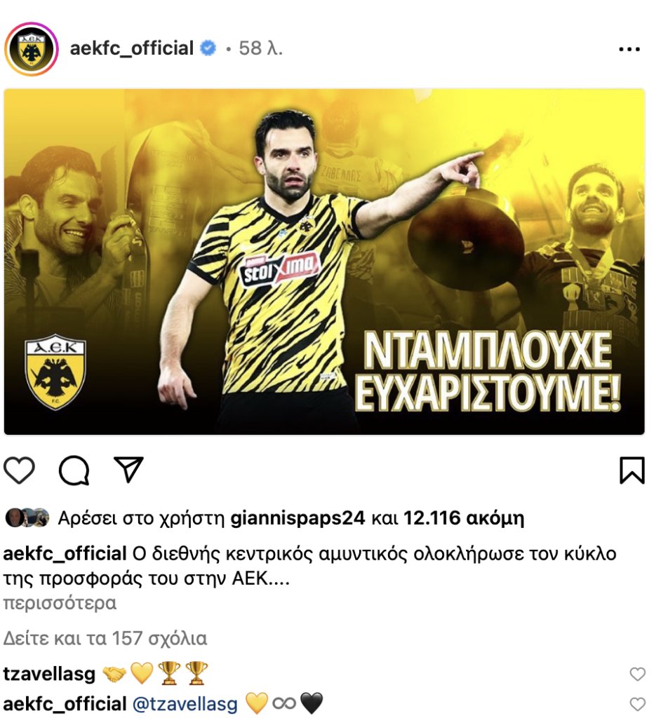 Η ΑΕΚ αποχαιρέτησε τον Γιώργο Τζαβέλλα και τον ευχαρίστησε για την μεγάλη προσφορά του, με τον ίδιο τον διεθνή κεντρικό αμυντικό να σχολιάζει στο ποστ της κιτρινόμαυρης ΠΑΕ με καρδιές και δύο κούπες, ενώ η ΑΕΚ απάντησε με το σύμβολο της αιώνιας αγάπης.