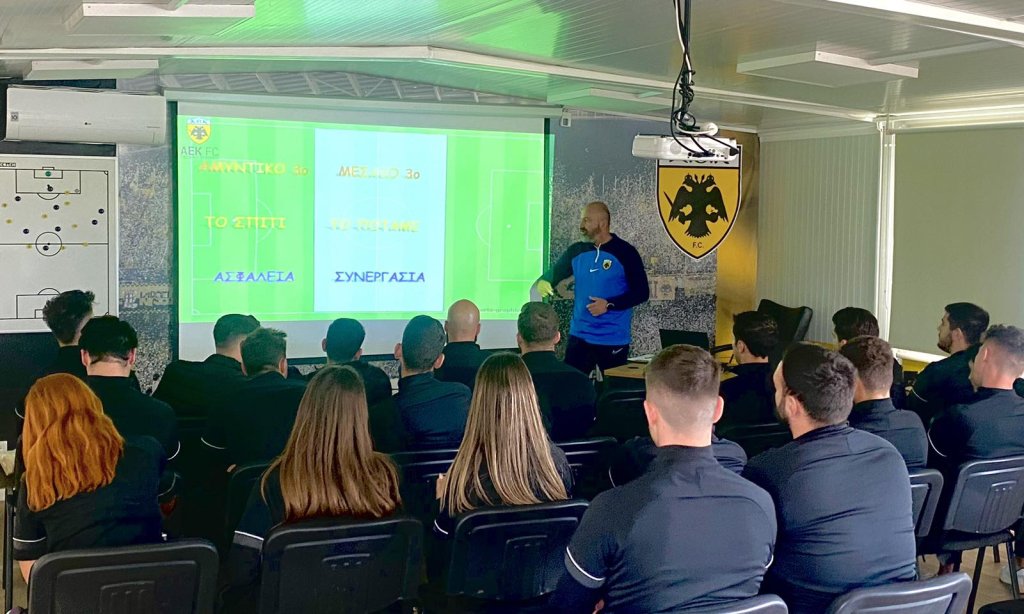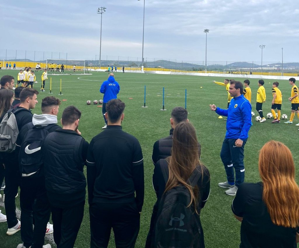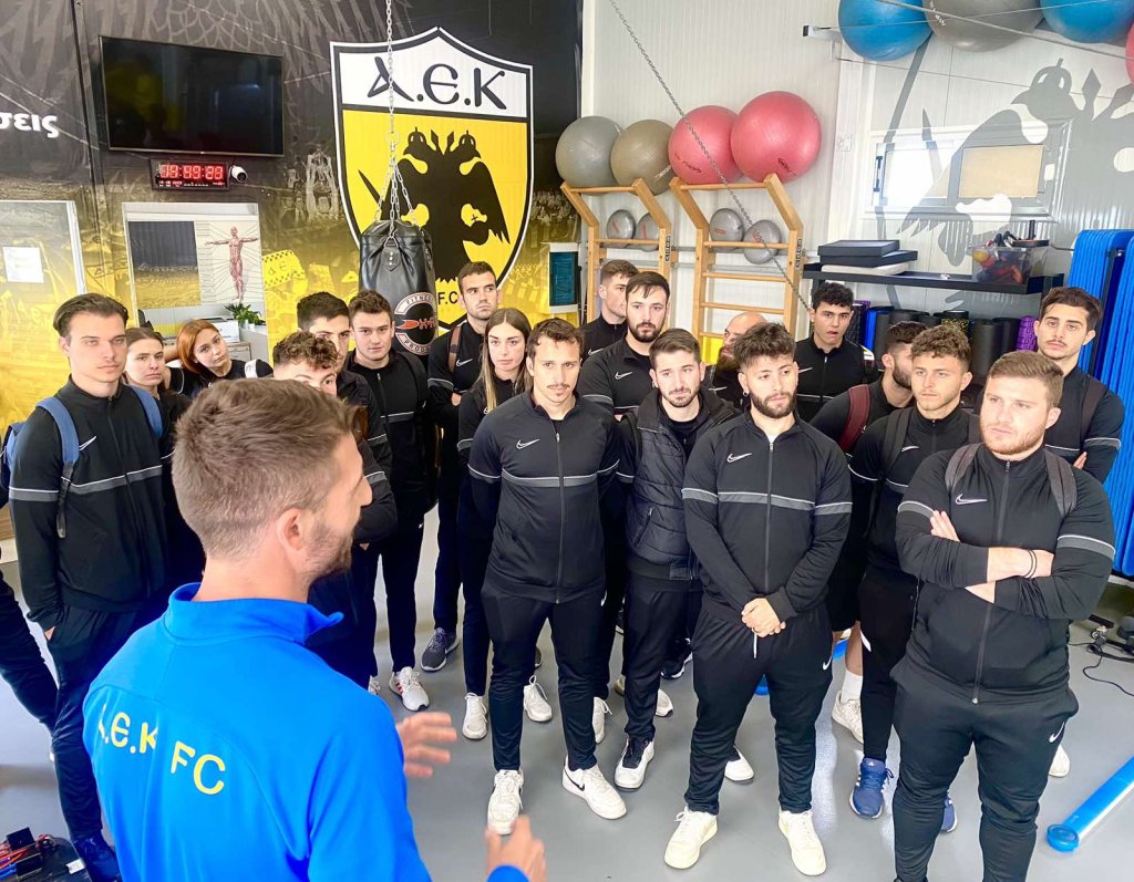 Την επίσκεψη των φοιτητών των ΣΕΦΑΑ (Σχολή Επιστημών Φυσικής Αγωγής και Αθλητισμού) Αθήνας με ειδικότητα ποδοσφαίρου υποδέχθηκε πρόσφατα η Ακαδημία Ποδοσφαίρου της ΠΑΕ ΑΕΚ στις εγκαταστάσεις της στα Σπάτα. Πραγματοποιήθηκε ξενάγηση από τον Αθλητικό Διευθυντή Ηλία Κυριακίδη, τους φυσιοθεραπευτές Λευτέρη Ταμβάκη και Νίκο Καλαμποκά και τον γυμναστή Αγγελο Κωνσταντόπουλο.