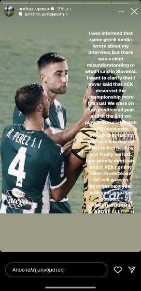 «Πληροφορήθηκα ότι κάποια ελληνικά μέσα ενημέρωσης έγραψαν για τη συνέντευξή μου. Αλλά υπήρξε μια σαφής παρανόηση στα λεγόμενα μου σε όσα είπα στη Σλοβενία. Θέλω να διευκρινίσω ότι ποτέ δεν είπα πως η ΑΕΚ άξιζε περισσότερο το πρωτάθλημα από εμάς! Ήμασταν στην πρώτη θέση όλη τη χρόνια και στο τέλος παίξαμε ένα κρίσιμο ματς με Covid, παρότι φυσικά έπρεπε να μας δώσουν λίγες μέρες για να γίνουμε καλά, και τελικά το χάσαμε. Προσωπικά δεν με νοιάζει ούτε η ΑΕΚ ούτε άλλη ελληνική ομάδα! Θα πάμε ακόμα πιο δυνατά και του χρόνου την καταπληκτική στήριξη σας! Πάνω απ’ όλα Παναθηναϊκός»