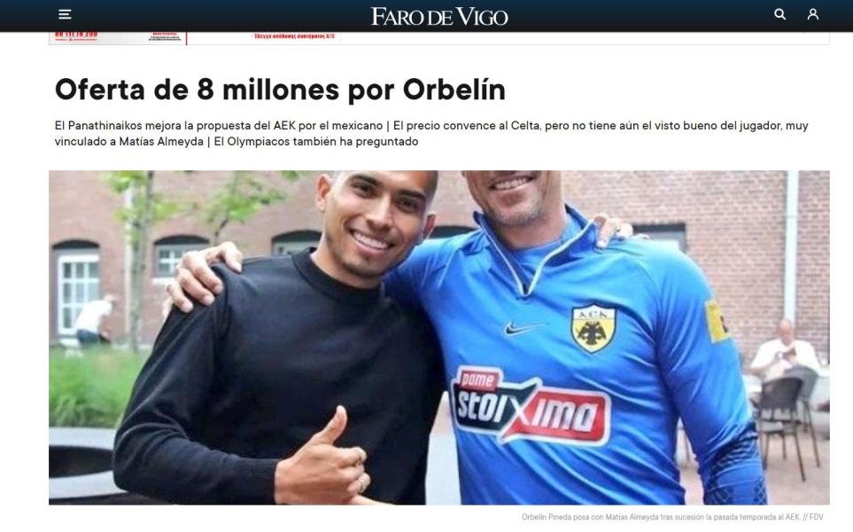 Την ώρα που περιμένει να μιλήσει με τον Ορμπελίν, ο οποίος αυτές τις μέρες βρίσκεται στην εθνική ομάδα του Μεξικού, η Θέλτα είναι θετική στο να δεχτεί την πρόταση, αλλά η ΑΕΚ δεν αποκλείεται να κάνει νέα προσφορά. Ο Ολυμπιακός έχει δείξει επίσης ενδιαφέρον για την κατάσταση του ποδοσφαιριστή, χωρίς ακόμα να έχει καταθέσει πρόταση".