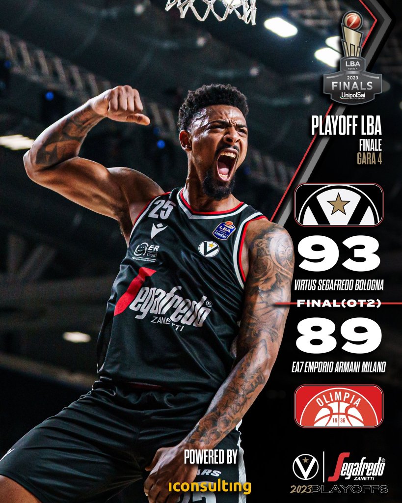 Μετά από ένα συγκλονιστικό παιχνίδι και δύο παρατάσεις η Βίρτους Μπολόνια πήρε την εντός έδρας νίκη επί της Αρμάνι Μιλάνο με 93-89 και έκανε το 2-2 στη σειρά των τελικών.