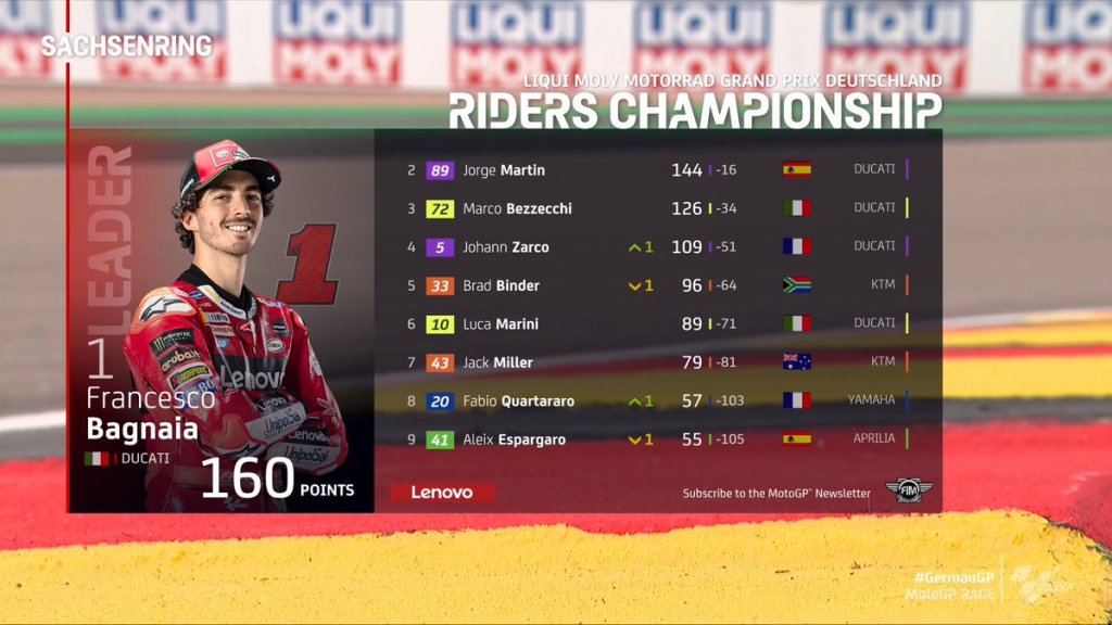 Ο Ιταλός έδωσε κι αυτός μεγάλη μάχη διεκδικώντας την πρώτη θέση, όμως δεν τα κατάφερε και βλέπει την πρωτοκαθεδρία του σε όλη τη διάρκεια της σεζόν να απειλείται άμεσα. Την τρίτη θέση του βάθρου κατέκτησε ο Ζοάν Ζαρκό, με την Pramac να κάνει το 1-3 στη Γερμανία και την Ducati έναν συνολικό θρίαμβο.