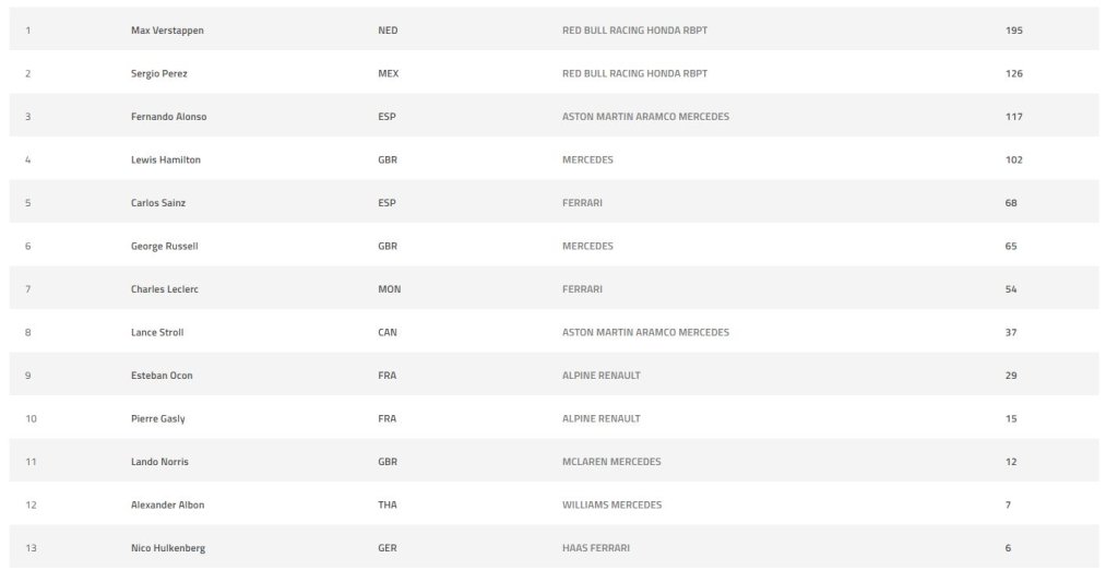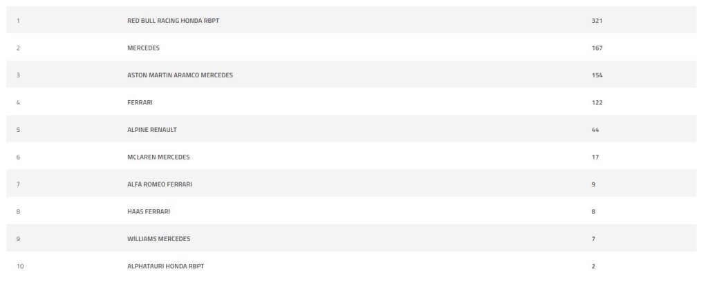 Στην κατάταξη των κατασκευαστών, η Red Bull συνεχίζει να κυριαρχεί με 321 πόντους, στην δεύτερη θέση η Mercedes με 167, ενώ η Aston Martin παραμένει μπροστά από τη Ferrari.