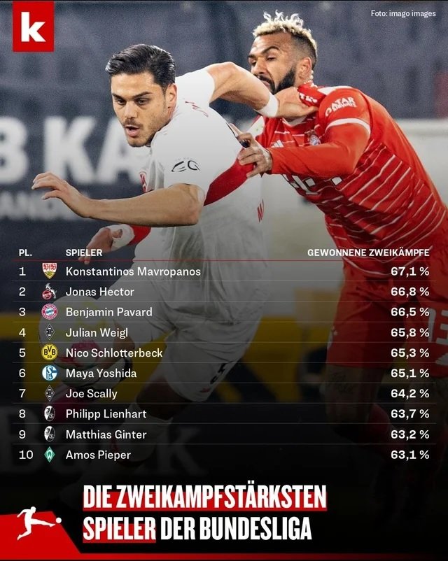 Συγκεκριμένα, ο 25χρονος κεντρικός αμυντικός έχει το καλύτερο ποσοστό επιτυχημένων τάκλιν στην Bundesliga. Με το ποσοστό σωστών επεμβάσεών του να φτάνει το 67.1%.