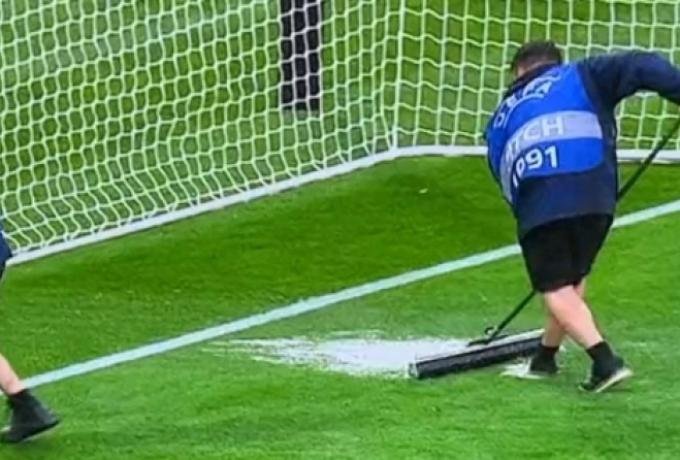 Οι υπεύθυνοι του γηπέδου προσπάθησαν να απομακρύνουν το νερό από τον αγωνιστικό χώρο με σκούπες, με την αναμέτρηση μετά από περίπου 20λεπτη διακοπή να μην έχει ξεκινήσει ακόμη...