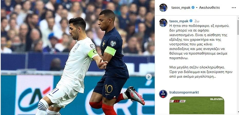 Η Ελλάδα δεν τα κατάφερε στη Γαλλία, κόντρα στους «τρικολόρ» του Ντιντιέ Ντεσάν με τη «γαλανόλευκη» να γνωρίζει την ήττα με 1-0 με τον Τάσο Μπακασέτα να μην είναι ικανοποιημένος από το τελικό αποτέλεσμα. «Η ήττα στο ποδόσφαιρο, εξ ορισμού, δεν μπορεί να σε αφήσει ικανοποιημένο. Είναι η αίσθηση της εξέλιξης του χαρακτήρα και της νοοτροπίας που μας κάνει αισιοδοξους και μας αναγκάζει να θέλουμε να προσπαθήσουμε ακόμα παραπάνω. Μια μεγάλη σεζόν ολοκληρώθηκε. Ώρα για διάλειμμα και ξεκούραση πριν από μια ακόμα μεγαλύτερη…», έγραψε στον προσωπικό του λογαριασμό στο Instagram o Μπακασέτας.