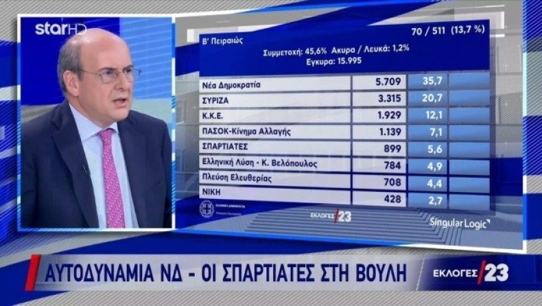 Ο βουλευτής της Νέας Δημοκρατίας φιλοξενήθηκε, την Κυριακή, στο πλατό της εκλογικής εκπομπής του Star, και η δημοσιογράφος Μάρα Ζαχαρέα τον ρώτησε το εξής: "Έχει ευθύνη κατά τη γνώμη σας για την είσοδο των Σπαρτιατών με ένα πολύ καλό ποσοστό;".
