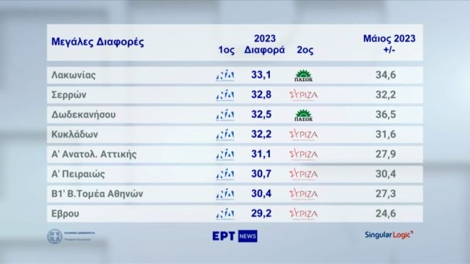 Στη Λακωνία σημειώθηκε η μεγαλύτερη διαφορά μεταξύ του πρώτου και του δεύτερου κόμματος στην επικράτεια με εντυπωσιακή διαφορά 33,1 μονάδων και ακολουθούν οι Σέρρες και τα Δωδεκάνησα. Αλλά και στην Ανατολική Αττική είναι εντυπωσιακή η διαφορά ΝΔ και ΣΥΡΙΖΑ.