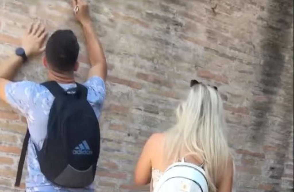 Ο άνδρας πιάστηκε να γράφει τ΄όνομα της συντρόφου του πάνω στο ιστορικό μνημείο. Ένας άνδρας τον εντόπισε και άρχισε να τον τραβάει βίντεο, ενώ τον επέκρινε έντονα. «Είσαι σοβαρός;» τον ρωτούσε και τον αποκάλεσε «ηλίθιο».