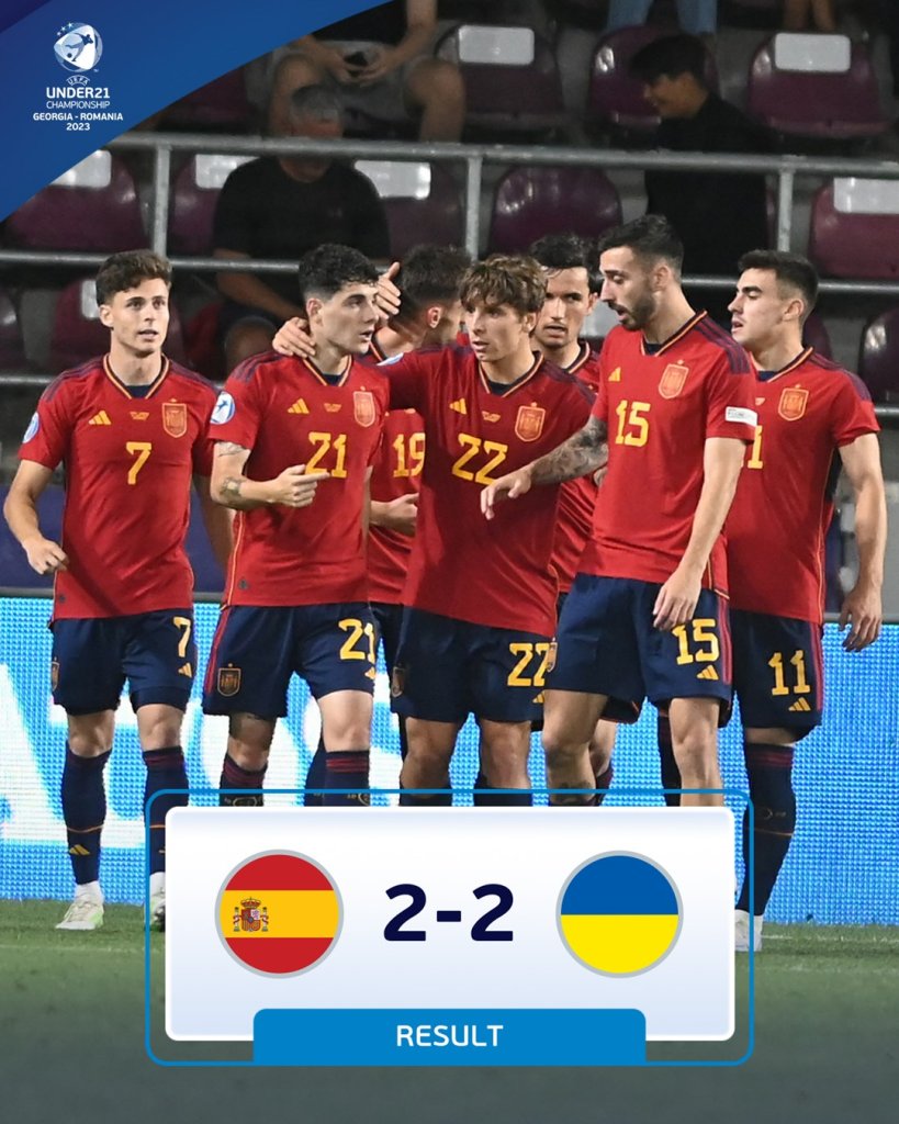 Τελικά, οι Ουκρανοί πήραν το προβάδισμα στο 43', μετά από σέντρα του Ναζαρένκο και κεφαλιά του Βιούνικ, πριν οι Ισπανοί ισοφαρίσουν στο 49' με αυτογκόλ του Ζέλιζκο. Στο 81' η Ουκρανία «αγκάλιασε» την πρωτιά, με τον Σουντάκοφ να κάνει το 2-1 με εύστοχη εκτέλεση πέναλτι, πριν ο Αμπέλ Ρουίθ ισοφαρίσει για το τελικό 2-2, στο 90'.