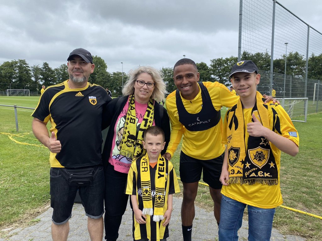 Κιτρινόμαυρο χρώμα στην απογευματινή προπόνηση της ΑΕΚ στο Burgh-Haamstede. Καθώς, μια Ενωσίτικη οικογένεια που διαμένει στην Γερμανία, έκανε το ταξίδι Γκελζενκίρχεν - Ολλανδία, περίπου 3,5 ώρες οδικώς, για να δει από κοντά και να φωτογραφηθεί με τους ποδοσφαιριστές και τον Ματίας Αλμέιδα. Φυσικά κανένας από τους παίκτες δεν χάλασε χατήρι στους γονείς και τα δύο τους παιδάκια που ήταν άπαντες ντυμένοι στα κιτρινόμαυρα με φανέλες και κασκόλ και έδωσαν το δικό τους όμορφο χρώμα στην απογευματινή προπόνηση…