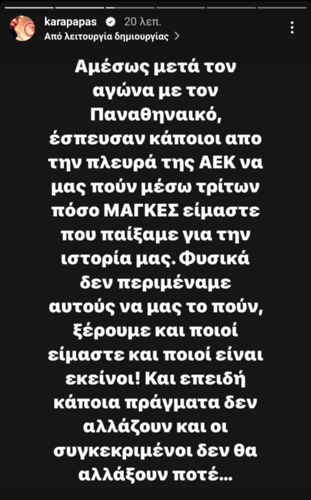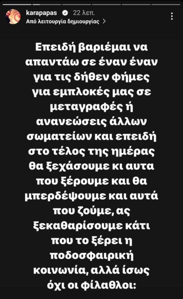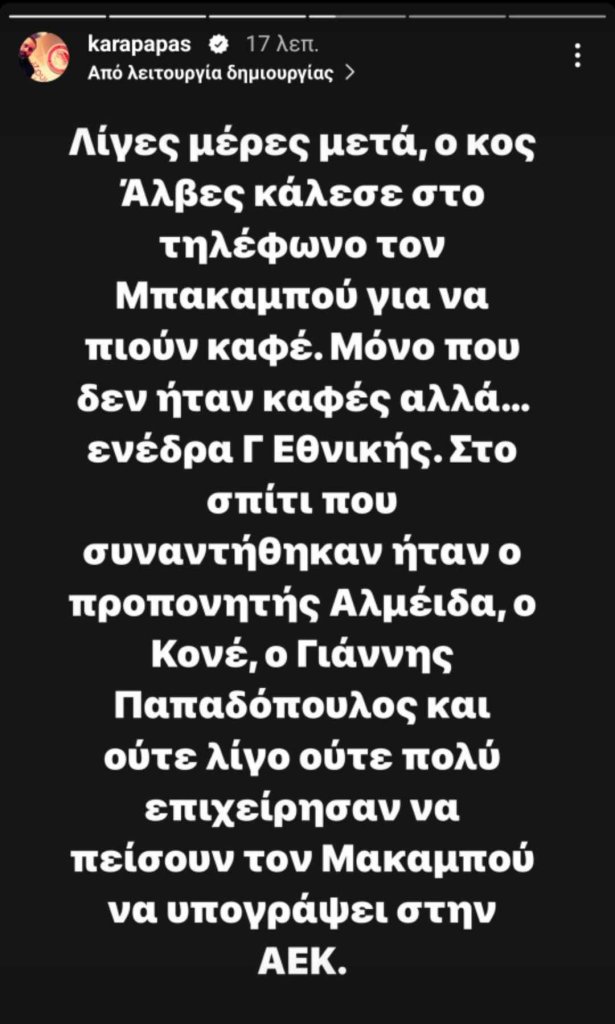 Η ΑΕΚ έχει γίνει εφιάλτης του Ολυμπιακού και στην προκειμένη περίπτωση του Κώστα Καραπαπά. Ο αντιπρόεδρος της ΠΑΕ Ολυμπιακός μέσω stories του στο Instagram προσπάθησε να… παρηγορήσει τους οπαδούς της ομάδας του για το γεγονός ότι δεν κατάφεραν να κρατήσουν τον πρώτο τους περσινό σκόρερ τον Μπακαμπού, ο οποίος επέλεξε να φυγει από τον Πειραιά για την Αραβία.