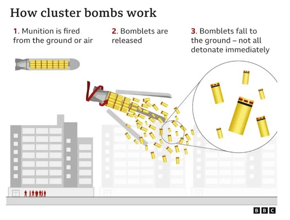 Οι βόμβες διασποράς έχουν απαγορευτεί από περισσότερες από 100 χώρες λόγω του κινδύνου που ενέχουν για τους αμάχους, καθώς απελευθερώνουν πολλά μικρότερα βομβίδια που μπορούν να σκοτώσουν αδιακρίτως σε μεγάλη έκταση.
