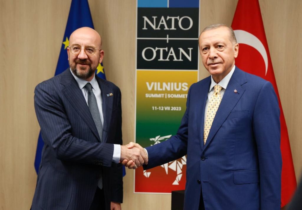 Ο Ερντογάν και ο πρόεδρος του Ευρωπαϊκού Συμβουλίου Σαρλ Μισέλ συμφώνησαν από κοινού να «ενεργοποιήσουν εκ νέου» τις σχέσεις μεταξύ της Τουρκίας και της ΕΕ, ανακοίνωσε σήμερα ο Σαρλ Μισέλ στο τέλος της συνάντησής τους στο Βίλνιους, στο περιθώριο της συνόδου κορυφής του ΝΑΤΟ.