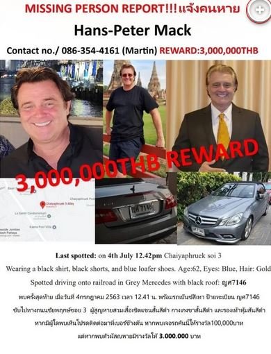 Ο Χανς Πέτερ Μακ, επιχειρηματίας στον χώρο των ακινήτων, αγνοούνταν από τις 4 Ιουλίου, όταν η 24χρονη Ταϊλανδή σύζυγός του είπε ότι δεν επέστρεψε στο σπίτι από μια επαγγελματική συνάντηση, σύμφωνα με την Bangkok Post.