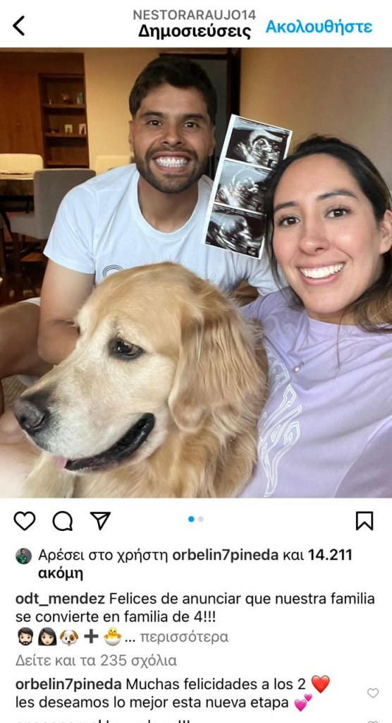 Μάλιστα η σύζυγος του Αραούχο είναι έγκυος και στο τελευταίο του post στο instagram όπου δημοσιοποίησε το υπερηχογράφημα υπάρχουν σχόλια τόσο από τον Πινέδα όσο και από τη σύζυγο του, με ευχές.