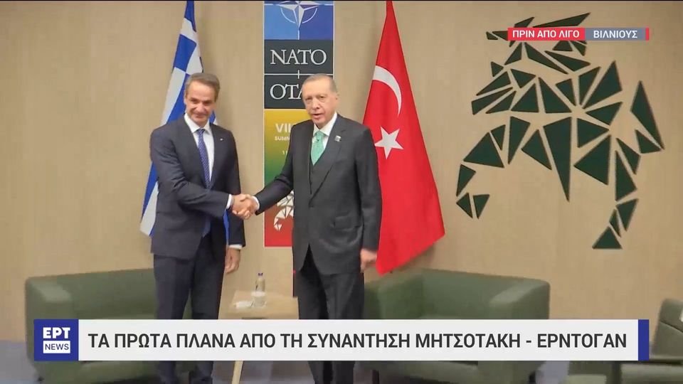 Σχεδόν 16 μήνες από το «ραντεβού» κορυφής της Κωνσταντινούπολης, Κυριάκος Μητσοτάκης και Ρετζέπ Ταγίπ Ερντογάν πιάνουν και πάλι το νήμα των μεταξύ τους συναντήσεων. Σε εξέλιξη αυτήν την ώρα η συνάντησή τους στο περιθώριο της Συνόδου του ΝΑΤΟ, στο Βίλνιους. Η ελληνική πλευρά προσέρχεται στο ορόσημο της Τετάρτης, με θετική ατζέντα και βλέποντας ευκαιρία, προκειμένου να ανοίξει ένα παράθυρο επανεκκίνησης στις σχέσεις της Αθήνας με την Άγκυρα, με ξεκάθαρες, ωστόσο, τις κόκκινες γραμμές