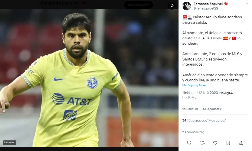 Συγκεκριμένα ο δημοσιογράφος, Φερνάνδο Εσκιβέλ τονίζει ότι «ο Νέστορ Αραούχο είναι προς αποχώρηση από την Αμέρικα. Αυτή τη στιγμή η μόνη ομάδα που έχει καταθέσει προσφορά, είναι η ΑΕΚ, ενώ υπάρχει ενδιαφέρον από Ισπανία και Τουρκία. Προηγουμένως ενδιαφέρθηκαν δύο ομάδες του MLS και η Σάντος Λαγκούνα. Η Αμέρικα είναι πρόθυμη να το πουλήσει αρκεί να έρθει μια καλή προσφορά».