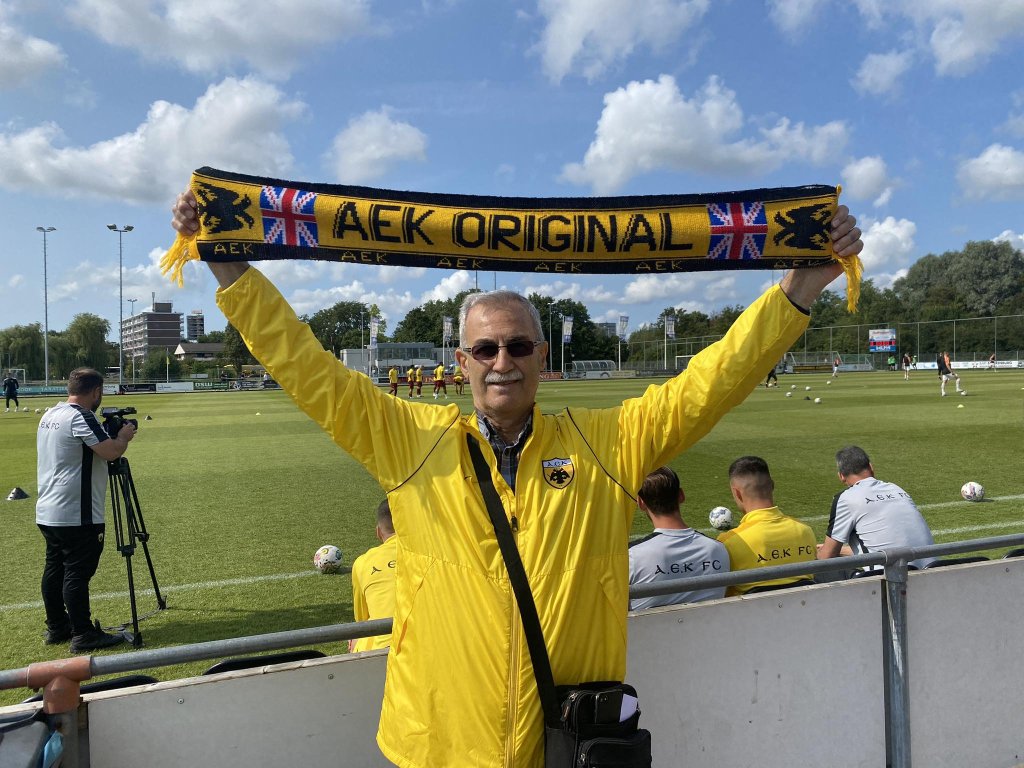 Ένα από τα ιδρυτικά μέλη της ORIGINAL Ρόδου, ο Φιλήμωνας Γιαμμαλής, που ζει στην Ολλανδία και συγκεκριμένα στο Ρότερνταμ, έκανε σήμερα το ταξίδι προς το Σιένταμ για να δει την αγαπημένη του ΑΕΚ από κοντά και το φιλικό με την Σαχτάρ Ντόνετσκ. Το κιτρινόμαυρο χρώμα είναι έντονο εδώ στο Σιένταμ με πολλούς φίλους της ΑΕΚ να δίνουν το παρών.