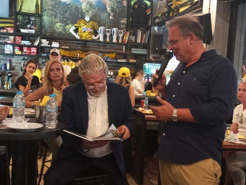 To «παρών» στην παρουσίαση του νέου βιβλίου του Γεράσιμου Γασπαρινάτου «Μια ομάδα στον κόσμο αγαπώ», στη «Βυζαντινή Γωνιά», έδωσε ο Δημήτρης Μελισσανίδης. Ο Μελισσανίδης έφτασε λίγο μετά τις 20:00 και έτυχε θερμής υποδοχής από τον κόσμο, σε ένα γεμάτο μαγαζί και υπό τους ήχους του ύμνου της ΑΕΚ.