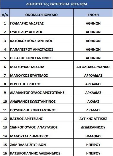 Συγκεκριμένα, ο νέος πίνακας της πρώτης κατηγορίας θα έχει 27 διαιτητές. Κατσικογιάννης, Βάτσιος, Ανδριανός, Τσιάρας, Πουλικίδης είναι τα νέα ονόματα στον πίνακα, με τους δύο πρώτους να επιστρέφουν. Ανδριανός, Τσιάρας και Πουλικίδης θα πάρουν το βάπτισμα του πυρός. Εκτός πινάκων, δε, έμειναν οι Αγγελάκης, Καραντώνης και Τζοβάρας.